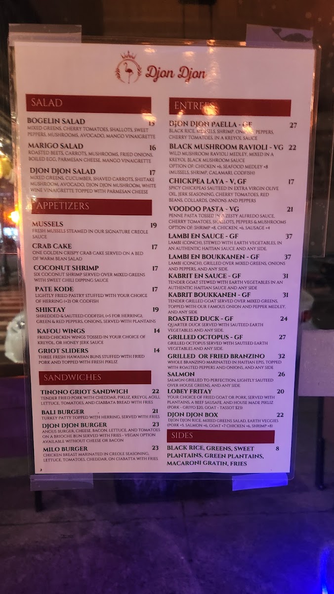 DjonDjon serves up a delectable array of dishes that showcase the essence of Haitian cooking, with a menu bursting with color and flavor. Start your culinary journey with tantalizing appetizers like Pate Kode, lightly fried pastries filled with herring or codfish, or the Coconut Shrimp, six pieces of crispy shrimp served on a bed of mixed greens with a delightful sweet chili dipping sauce. For a taste of something heartier, savor the Legume Stew paired with sweet plantains, a dish that transports you straight to the homestyle kitchens of Haiti. Customers rave about the scrumptious Voodoo Pasta, customizable with your choice of flavorful ingredients, creating an unforgettable dining experience.